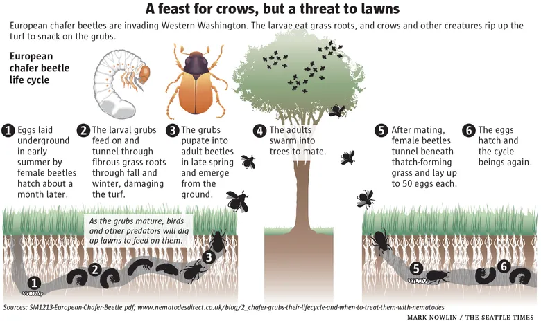 - Wildlife Activity: Increased activity from animals like raccoons, skunks, or birds digging up your lawn indicates a feast on chafer beetle grubs.